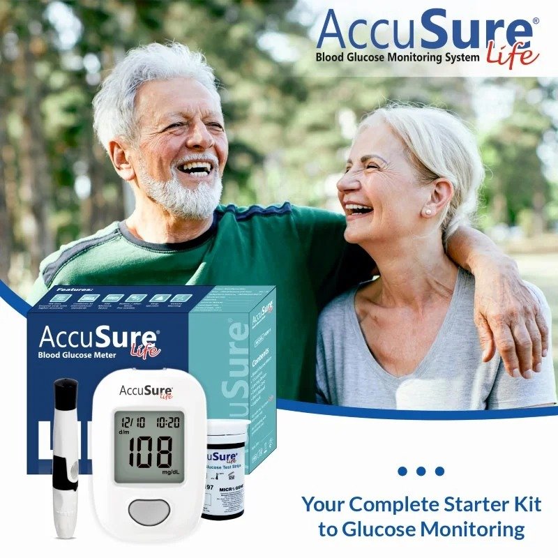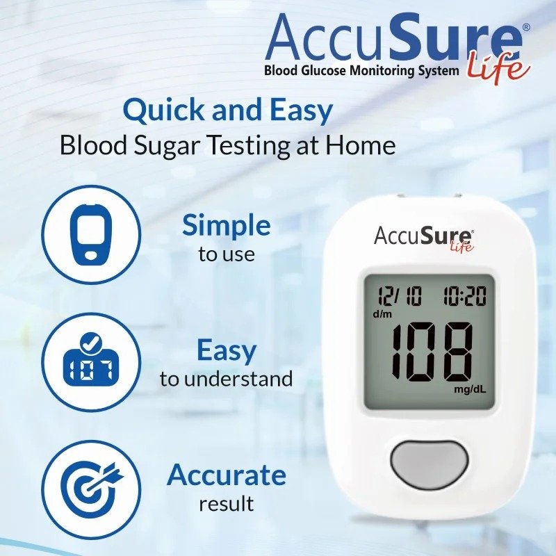 Engineered for dependable results, accusure blood glucose test strips support consistent performance, helping users stay confident in their daily monitoring. The glucometer stores up to 500 readings, making it easy to track long-term trends. With before/after meal markers, you gain better insights into how food affects your glucose levels. A built-in ketone warning function also enhances safety for users at risk of high ketone buildup.