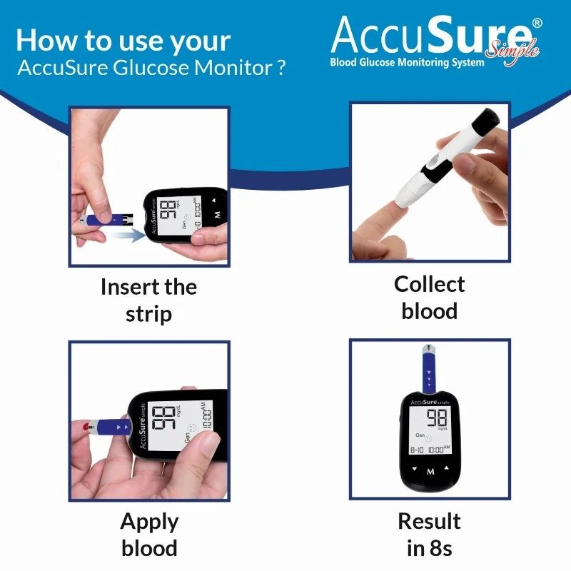 Managing diabetes is easier with the AccuSure Simple Glucometer, designed for comfort and accuracy. It delivers fast results in just a few seconds with a very small blood sample, ensuring less pain with the option of alternative site testing.